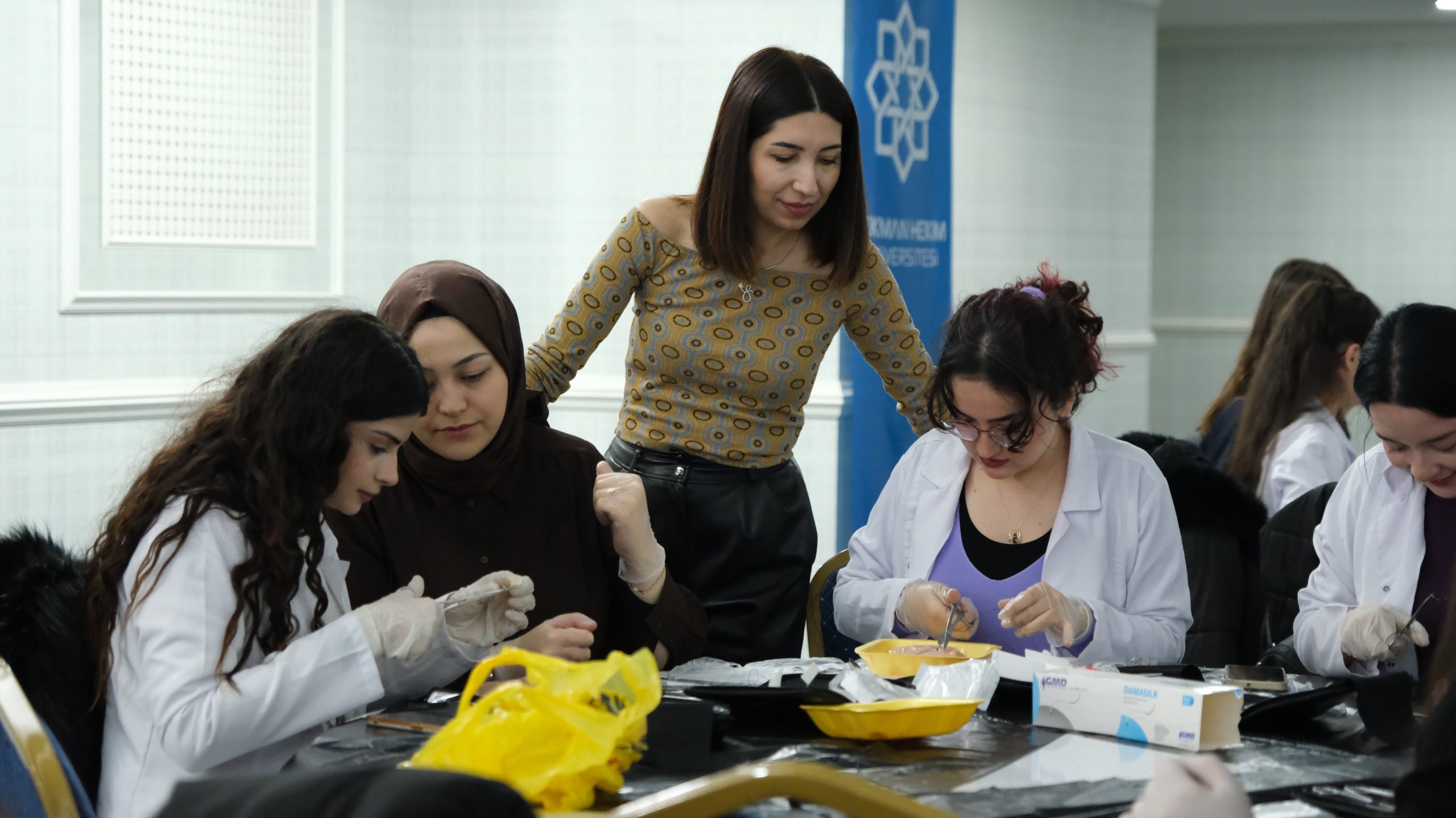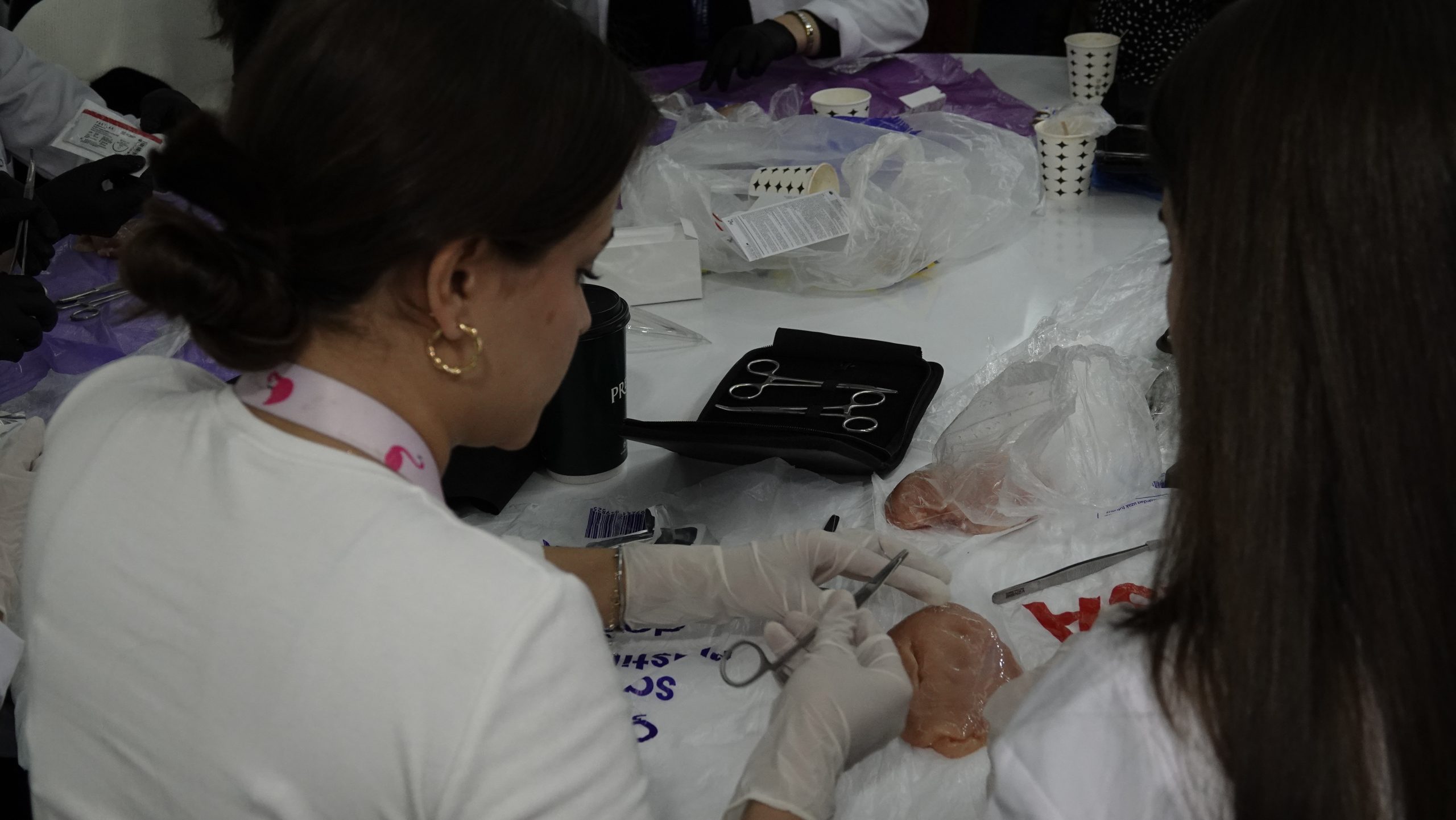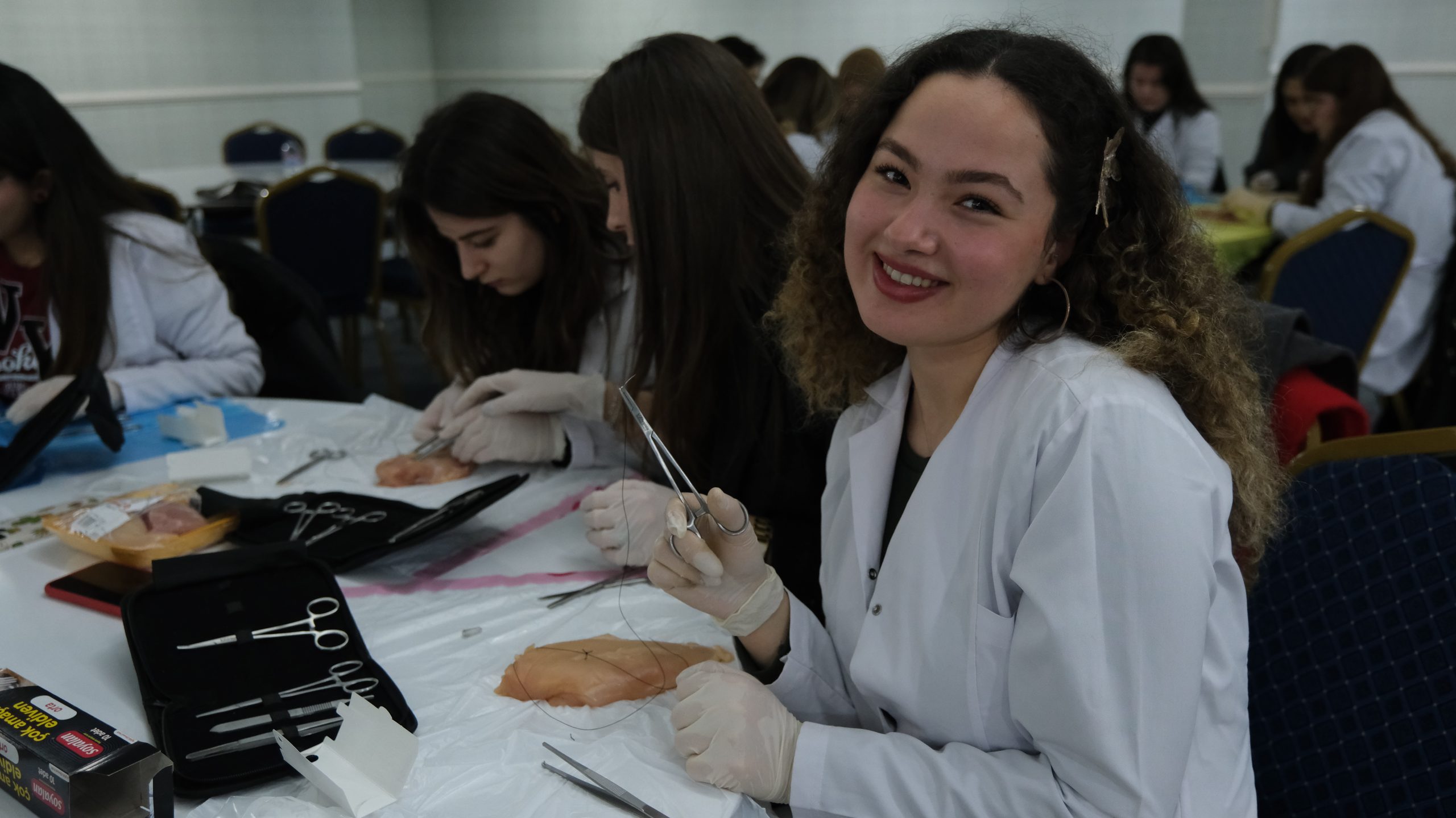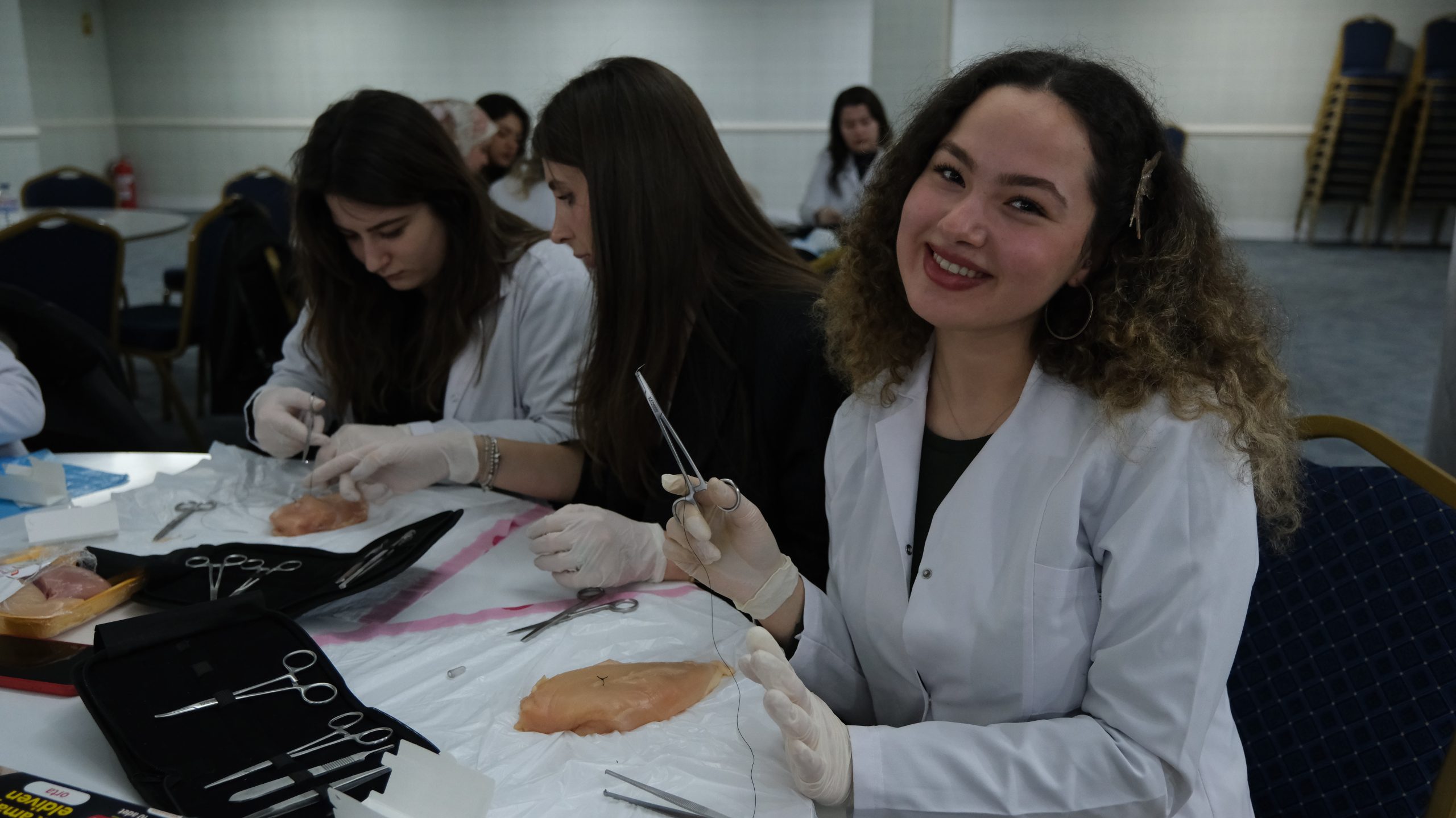 Bu sene 3.sü gerçekleşen workshopa ilgi yoğundu. Düzenleme kurulundaki Akademisyenlerin gözetiminde katılımcı öğrenciler tavuk eti üzerinde Sütur atma çalışmalarını gerçekleştirdi.