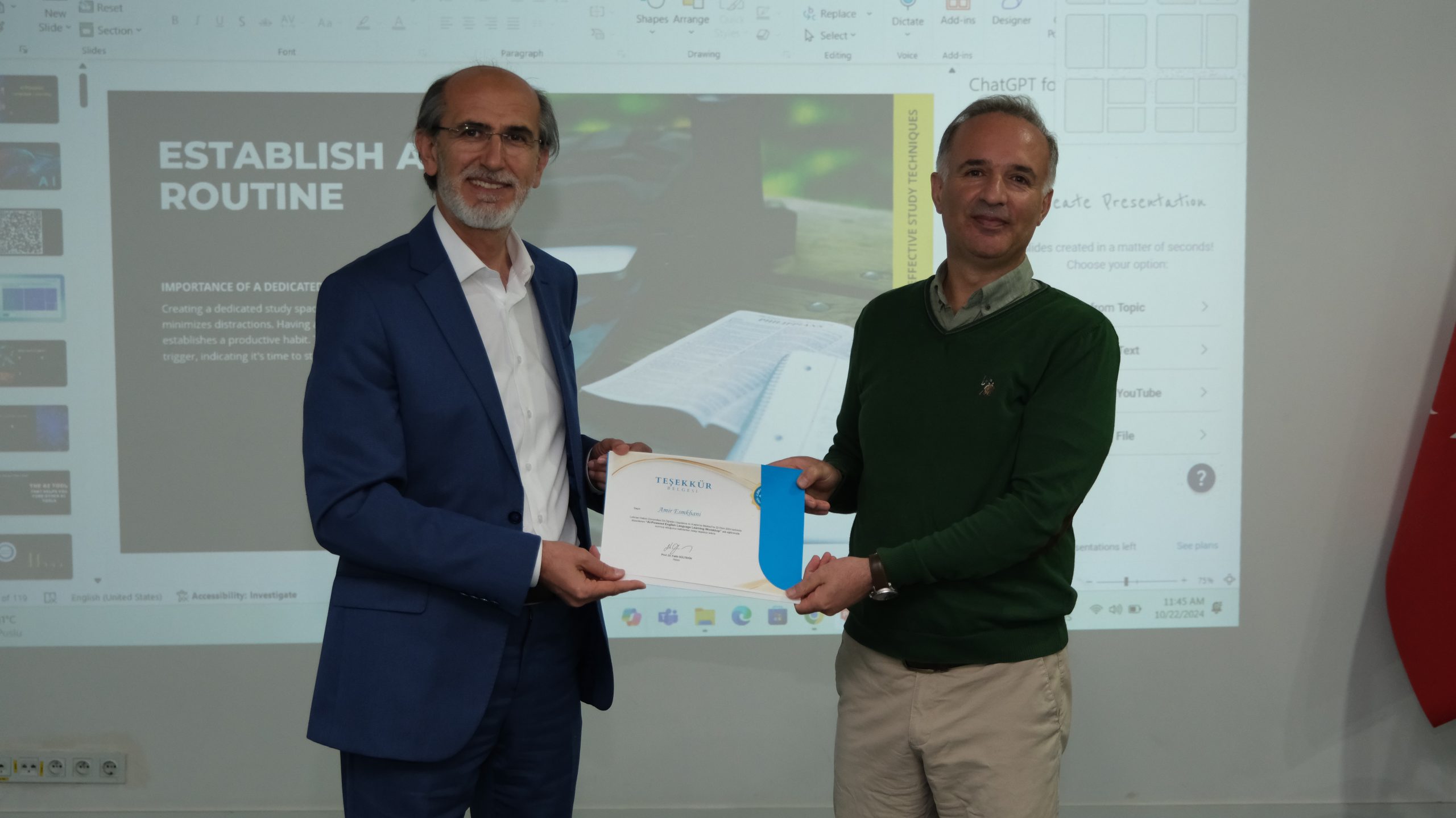 Etkinliğin sonunda Rektörümüz Prof. Dr. Fatih GÜLTEKİN, değerli konuğumuz Amir ESMKHANİ’ye teşekkür belgesini ve hediyesini takdim etti.