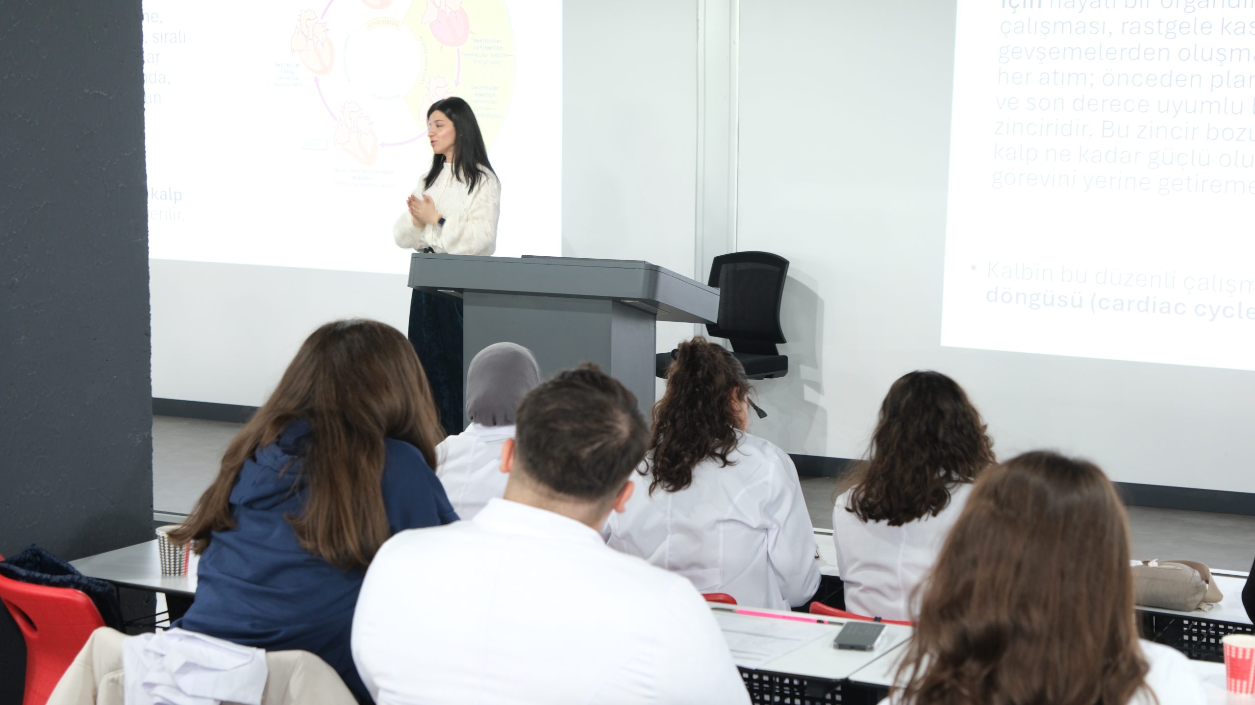 Programın ilk gününde gerçekleştirilen akademik oturumlarda, kalbin anatomik yapısı, kas dokusu, elektriksel iletim sistemi ve fizyolojik işleyişi ele alındı. Alanında uzman öğretim üyeleri tarafından yürütülen derslerde, konular lise düzeyine uygun bir çerçevede sunulurken, öğrencilerin aktif katılımını destekleyen soru–cevap bölümlerine de yer verildi.