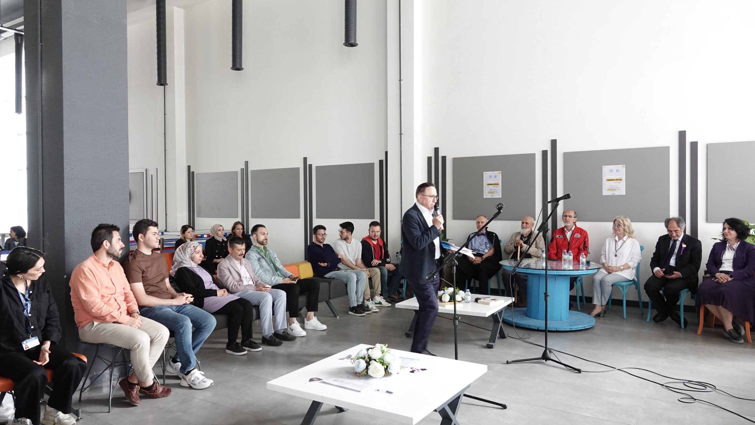 Lokman Hekim Üniversitesi A Blok Fuaye Alanında düzenlenen söyleşi etkinliğinde Mütevelli Heyet Başkanı Dr. Mehmet Altuğ, Rektör Prof. Dr. Fatih Gültekin, Rektör Yardımcıları, akademik- idari personelimz ve öğrencilerimiz katılım gösterdi.